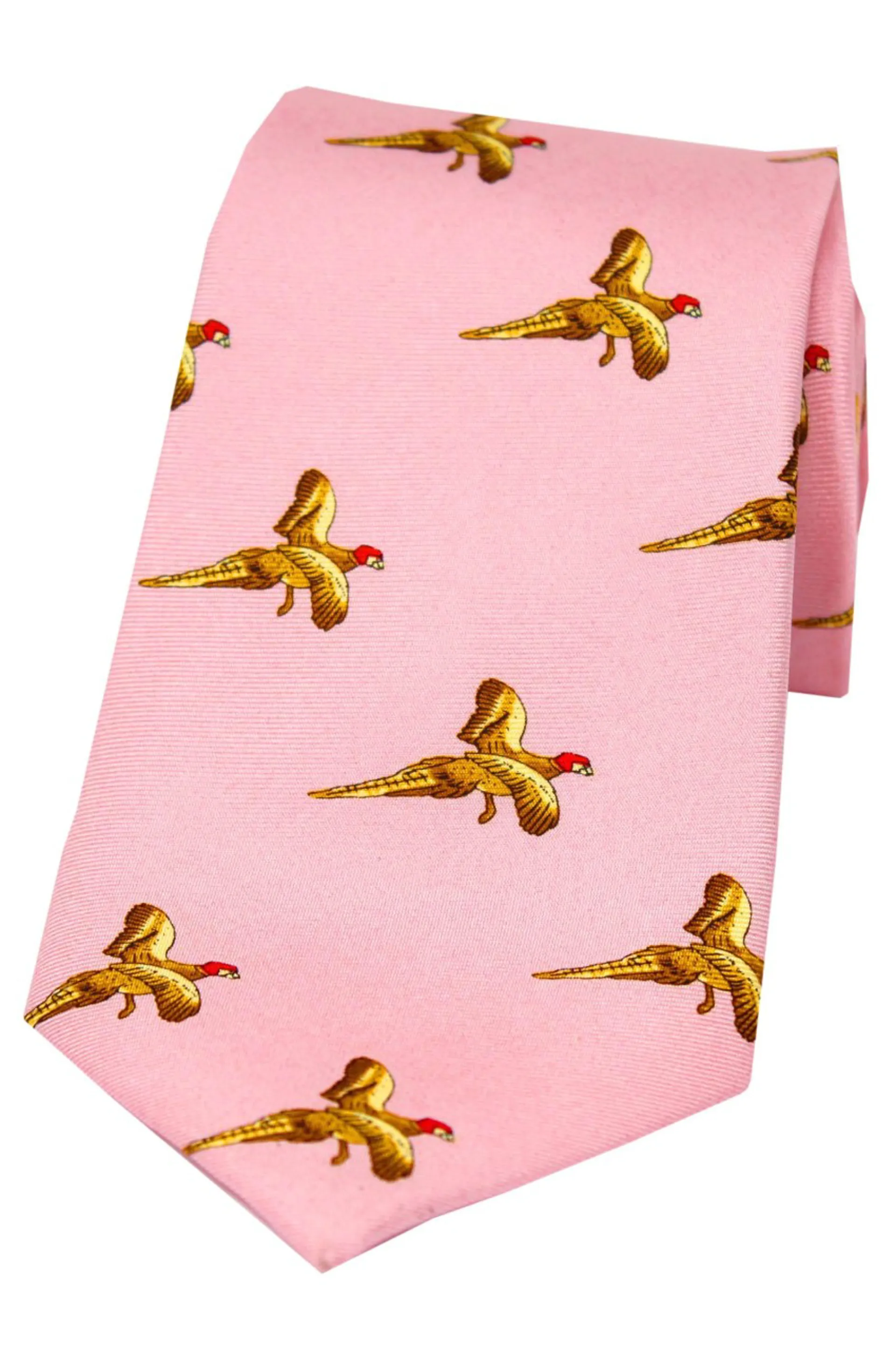 Soprano Flying Pheasants On Pastel Pink Ground Country Silk Tie, the perfect addition to any discerning Gentlemen's Country Wardrobe.