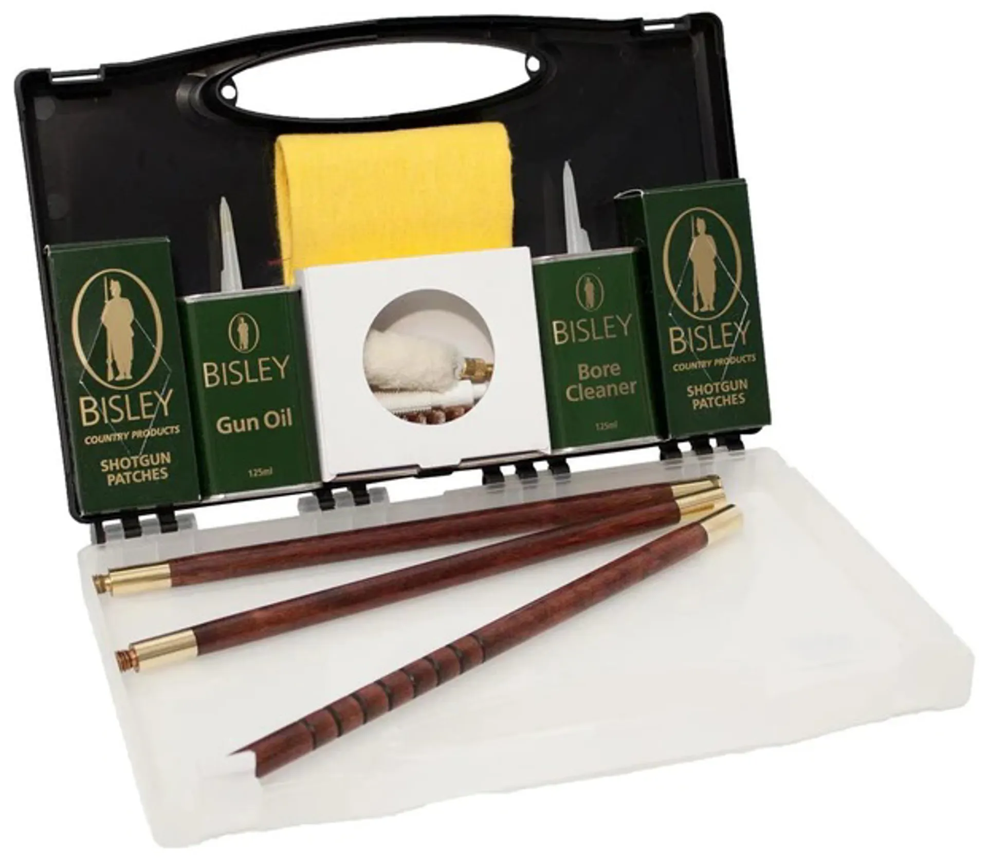 Durable presentation case. Includes three piece rod, phosphor bronze brush, wool mop, nylon jag, yellow duster, Bisley Gun Oil, Bisley Bore Cleaner & patches.